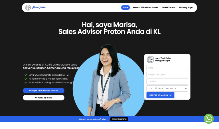 Laman web ini dibina khas untuk sales advisor yang menjual kereta baru di Malaysia. Ada profil anda sebagai SA, senarai model kereta, link Whatsapp dan pelbagai lagi.